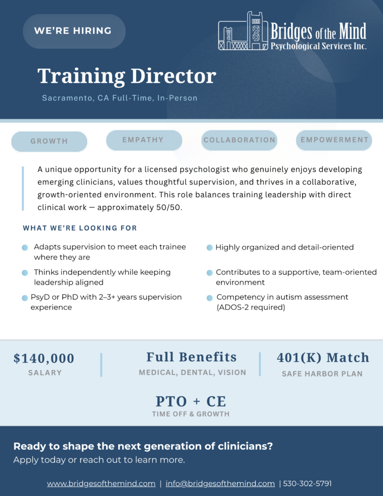 Bridges of the Mind Psychological Services, Inc., is not just a workplace; it’s a community where growth, empathy, and innovation thrive. We are actively seeking dedicated professionals who are eager to contribute their expertise and enthusiasm to our dynamic team.